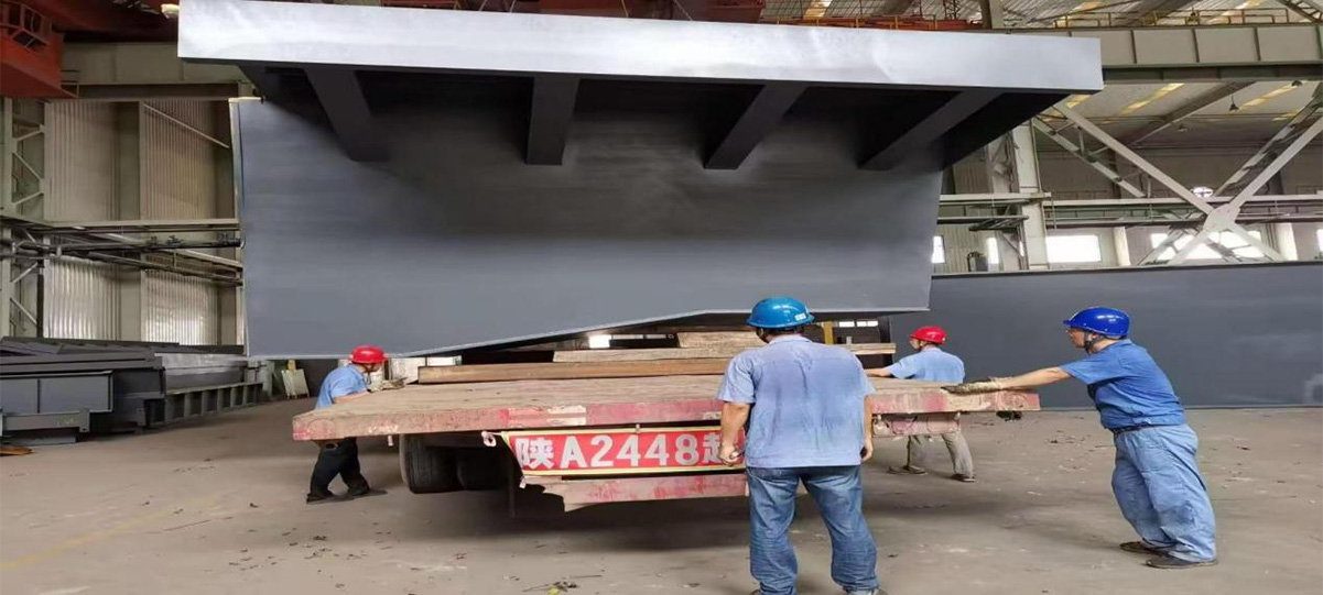 由于該項目鋼箱梁中的疊合梁數(shù)量較多,不僅內部結構復雜,而且外部形狀極不規(guī)則,裝車發(fā)運難度較大。為此,陜重公司的運輸公司,超前工作,在鋼箱梁的加工制作過程中,就提前深入到生產(chǎn)車間和現(xiàn)場,進行跟蹤,全面收集、匯總、計算鋼箱梁各部位的尺寸變化,再根據(jù)運輸?shù)能囆?,選用安全牢靠的鋼材,設計、制作運輸工裝,并首此采取了鋼箱梁"先在廠內試運,確認運輸安全后,再正式裝車發(fā)運出廠"的安全運輸方案,確保了400多塊鋼箱梁的正常安全運輸。
